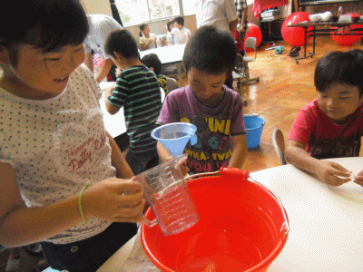 最後は水の入ったペットボトルに醤油さしで作ったサカナを圧力を加えて沈める実験でした。みんな科学者の目になっていました。