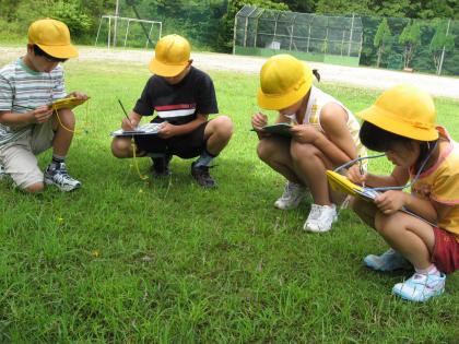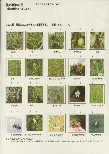 写真上のプリントを携帯し、夏の植物と虫をスケッチした後、グループごとで校庭周辺を観察しました。