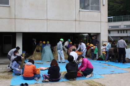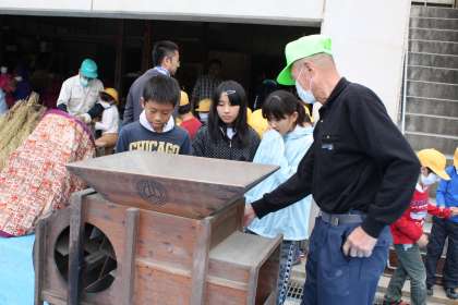 地域の方々には、朝から脱穀機の取り付けや唐箕の準備をしていただきました。また、保護者のみなさんには取り残した籾を稲から手作業で外していただきました。大変な作業でしたが、ご協力有り難うございました。