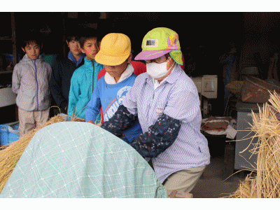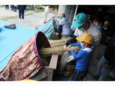 脱穀の様子です。 写真上から【1・2年生】【3・4年生】【5・6年生】