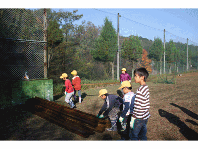 ウッドデッキの土台部分に床材を渡すための角材を取り付けました。あらかじめボルト穴を開けておいていただいたところへ、レンチを使って長いボルトを締め付け、土台に固定する作業です。角材が固定されたら、いよいよ床板を貼り付けます。電動ドライバーを使って木ねじで床材を固定します。低学年は力加減が上手くいかず、ドライバーが空回りすることもありましたが、高学年が手助けして全員で作業しました。