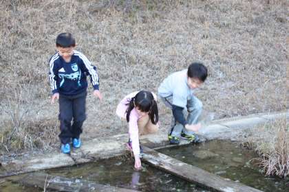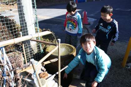 寒さに負けず(2) 公開日 2014/01/10 更新日 2014/01/10 今日のスナップ 寒くても、子ども達は水のそばに寄っていきます。その理由は・・・。ビオトープには氷が張り、手桶にはつららができています。そして、土の中からは、とても大きな霜柱を発見しました。