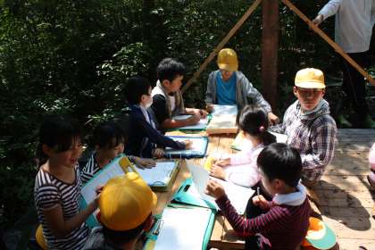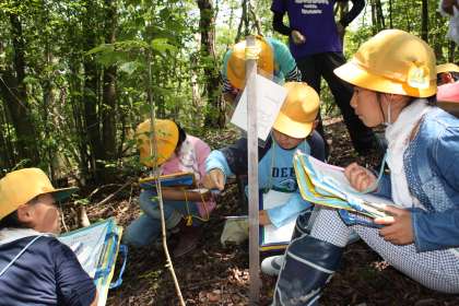 夏の森の学習 公開日 2014/07/15 更新日 2014/07/15 ふるさとの時間 神明の森のウッドデッキで、夏の森の学習を行いました。まず、森の中の観察です。せせらぎの水温、森の中の気温を測りました。次に、春に決めた班の木「気になる木」の観察です。幹の太さと高さ、葉の数を記録しました。