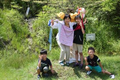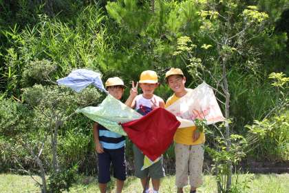 今日の2時間目に、3・4年生が運動場で図工の作品を作りました。「ぬのでかざろう」という学習です。3班に分かれて、大きな布を結んだり巻いたりして作品を作りました。写真は、上から「とり」「顔出し」「ハンモック」という題名の作品です。子どもの発想は豊かですね。