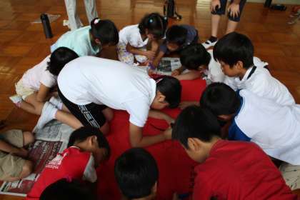 今日の長い放課、運動場とホールには、赤・白分かれて応援練習や旗を作成する子ども達の姿がありました。高学年児童を中心に子ども達だけで計画的に練習を進めています。 リーダーシップが発揮できる高学年児童、指示されたことを一生懸命がんばろうとする中・低学年児童の姿に感心します。