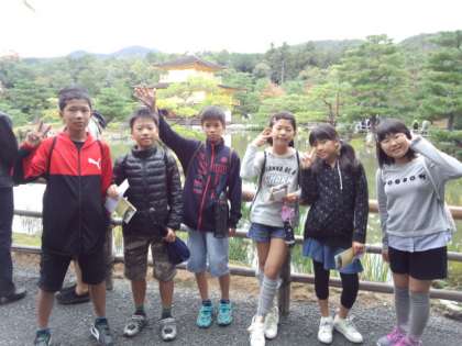金閣寺にて 公開日 2014/10/22 更新日 2014/10/22 最近の行事から とうとう最後の見学地、金閣寺です。さくらちゃんは「思っていたより金の光り具合が、明るく感じられました。」 英人くんは「思っていたより金閣は大きく、池に映る姿はきれいでした。」とのことです。