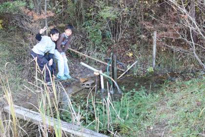 子ども達に人気の場所の一つがビオトープです。春から秋にかけて、オタマジャクシ、ヤゴ、アカハライモリなど様々な生き物が観察できます。本校のビオトープの自慢は、天然水を利用していることです。山の湧き水をホースで引いてきてビオトープに入れています。その水が落ちる部分に本校職員が「ししおどし」を作りました。青竹にたまった水が落ちるときに、「カーン」といういい音がします。風流なのはいうまでもありませんが、校庭に侵入する野生動物を追い払う効果も期待できます。まさに一石二鳥です。