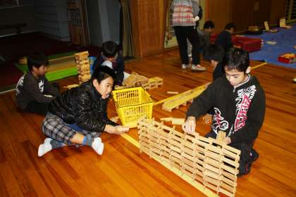 今日の授業後、本校体育館で「移動児童館」がありました。みんなこの日をとても楽しみにしています。1年生から6年生まで全員参加するのが本校の特徴です。