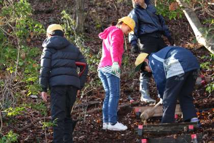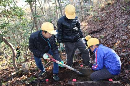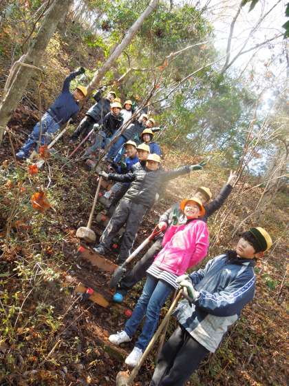 林道整備 公開日 2014/12/03 更新日 2014/12/03 今日のスナップ 今日のふるさとの時間に、森の中の林道を整備しました。1〜3年生は、はさみで下草や小枝の剪定をしました。4〜6年生は杭と板を利用して急な坂道に階段を作りました。子ども達には難しい作業だと思っていましたが、みんなで協力して30段の階段が見事にできあがりました。できあがった階段を見て、低学年の子ども達も歓声をあげていました。