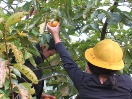 はさみを片手に柿の木に登ったり、下から飛びついたりしながら、楽しそうに全ての実を収穫しました。収穫した柿の実はしめて40個。一部を早速食してみたところ、八百屋さんで買った柿と何ら遜色はなく美味でした。