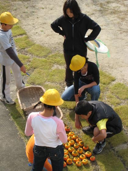 校庭の端に自生する柿の木が1本あります。秋の深まりと共に実が熟し、鳥たちが啄むようになったため、本日5・6年生が収穫しました。