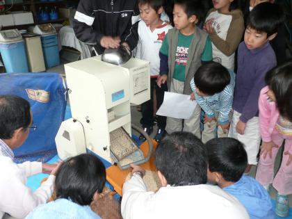 「もみすり機」の中で何が行われているかは定かではありませんが、「稲もみ」が「玄米」と「もみ殻」に分かれ別々の口から出てくる姿に、子ども達だけでなく我々教員も一同に驚きの眼差しで見入ってしまいました。