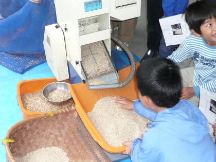 例年「もみすり」以後の行程を地域の方にお任せし機械で処理していたため、子ども達は「稲もみ」から「白米」に至る行程を知りませんでした。しかし、稲作をやめられた地域の方から「もみすり機」を寄付していただいたため、今年は「もみすり」も自分たちの手で行うことになりました。
