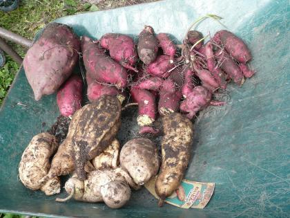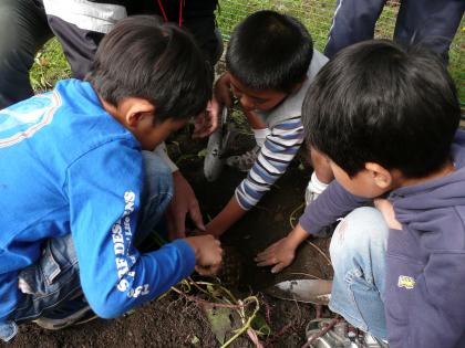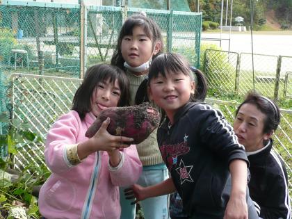 5月に植えたさつまいもが畑一面に蔓を伸ばし、そろそろ堀り頃になりました。11月14日の生活科の授業で、いよいよいも掘りをすることにしました。地面の下で、さつまいもはどのぐらい大きく成長しているのか、みんな楽しみにしていました。掘り始めると、出るわ、出るわ、大きないも、いも、いも・・・「わあ、大きないも!」「ここにも、いもがあった」と子どもたちの歓声。たくさんのいもが収穫できました。写真を見てください。すごいでしょう?