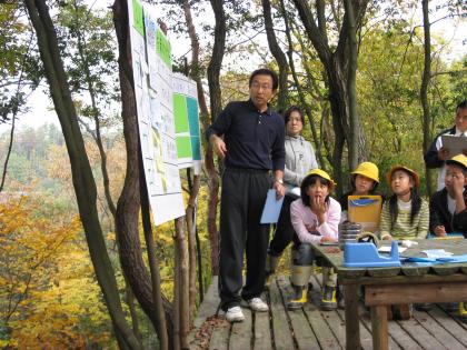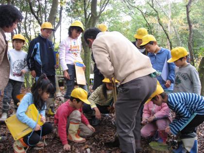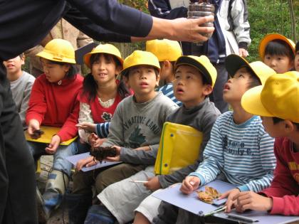これは、毎週木曜日の1時間目に行っている「自然学習」の一環として実施したもので、全校児童に発達段階に応じた課題を設定し、落ち葉が森にどのように貢献し、森は我々の生活にどのような役割を果たしているのかを学ぶ授業でした。