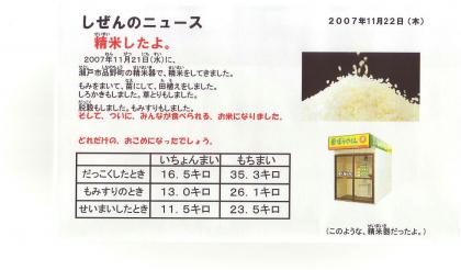 お米がぴかぴかに!! 公開日 2007/11/21 更新日 2007/11/21 ふるさとの時間 11月29日(木)に開催する収穫祭を目前に控え、玄米のまま保存されていた「もち米」と「イチョン米」を精米し、39kgの玄米が35kgの色白でぴかぴかのお米に変身しました。 収穫祭当日は、つきたて・炊きたてのお餅やご飯に姿を変え、約100人の招待客に振る舞います。口に入れた後、どんな表情が見られるか、どんな言葉が聞かれるか、楽しみでなりません。