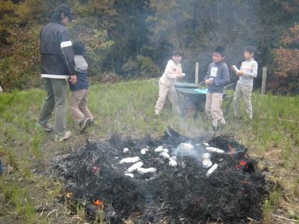 生活科の学習で、やきいもをしました。稲刈りのあとの田んぼを利用して、稲わらや枯れ葉などで焼きました。先日収穫したさつまいもを濡れた新聞紙でくるんで、その上からアルミ箔で包んで焼きました。いもを入れてから約1時間ほどで、焼き上がりました。包みをそうっとめくっていくと、やきいものいい香りがしてきました。少し折ってみると、中から黄金色のいもが・・・・おいしそう!焼きたてのほっかほっかのやきいも。「わあ、あつい、あつい。でも、おいしいね。」などと言いながら、みんなで食べました。全校児童・全職員で秋の味覚を堪能しました。本当においしい、おいしいやきいもでした。