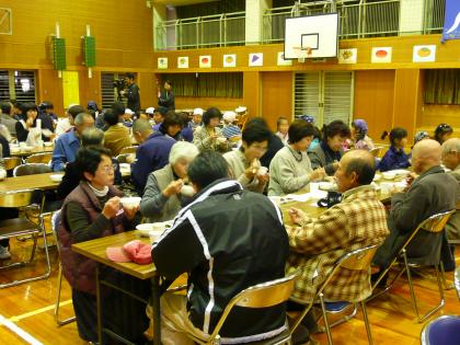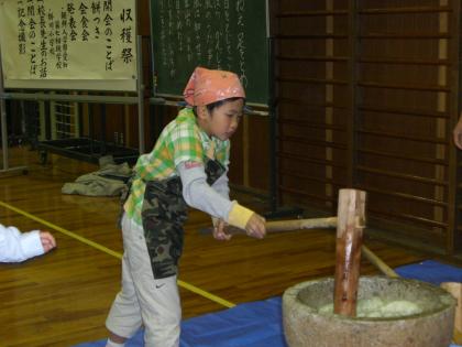 収穫祭では、収穫されたもち米を使って餅をつき、収穫の喜びを味わうと共に、日頃お世話になっている地域の方々をお招きして、餅をふるまったり演技を披露したりして、感謝の気持ちを伝えました。