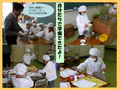 準備はあっという間に終了し、あとはたっぷり時間をかけて、初めて味わう小学校の給食を楽しんでいました。