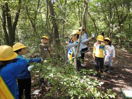 神明山の中腹の学習デッキへ歩いて行き、夏の森の学習を行いました。まず、沢の水温を測りました。18度くらいで前日に行った蛇が洞川と同じくらいでした。班の木を観察した後、森の涼しい空気、風を感じたり、セミや鳥の鳴き声を聞いたりして夏の森を五感で学んできました。