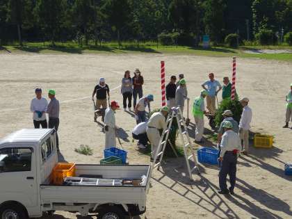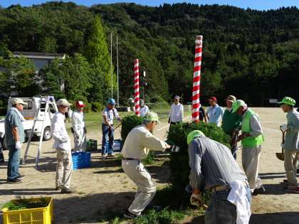 スポーツフェスタ準備 公開日 2018/09/29 更新日 2018/09/29 地域とともにある学校 スポーツフェスタ前日、地域の方々が、入場門の設置に来てくださいました。紅白の門柱を杉の葉で飾り、できあがりです。ありがとうございました。