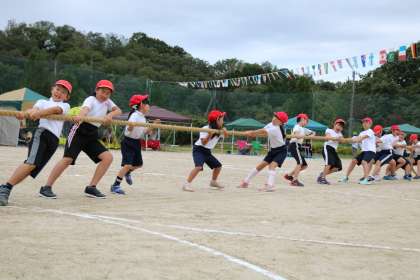 天候を考えて、先に綱引きと全員リレーを行いました。すでに紅白対抗は最高潮です。