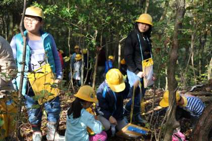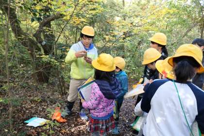 秋の森の学習で、神明山中腹の学習デッキへ行きました。講師の先生のご指導の下、秋の森を五感で感じ、紅葉し始めた葉や木の実を顕微鏡で観察しました。