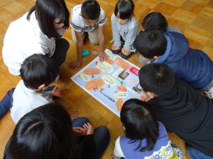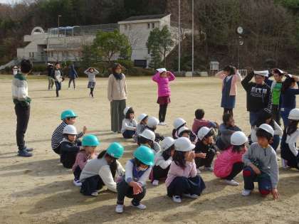 地震と火災を想定した避難訓練を行いました。今回は、避難途中で足をくじいて動けなくなる児童が出たという想定で行いました。他の児童には知らせていなかったのですが、ちゃんと「近くの先生を呼ぶ」という対応が取れました。訓練のあとは、ホールで「防災すごろく(地震編)」を行って、防災について考え、学びました。