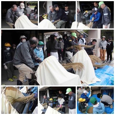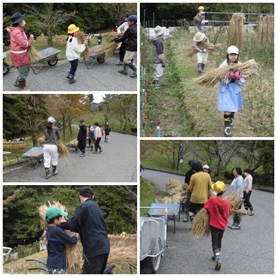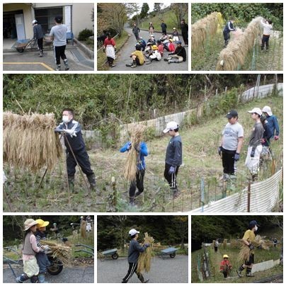 稲刈りのあと、はざ掛けしてあった稲束をピロティまで運びました。