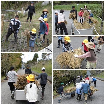 子どもたちは、一列に並んで田んぼに降り、一人ずつ稲束を抱えて舗装された道まで上がります。一度に運べる量は限られているので、同じ作業を何度も繰り返し行ないますが、どの子も順番を守り、意欲的に活動することができました。「もっと持てますよ」「これも片付けていいですか?」など、頼もしい声がたくさん聞こえてきて、うれしかったです。