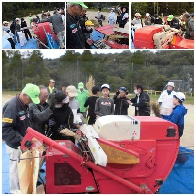 足踏み脱穀機や唐箕(とうみ)など、昔ながらの道具に、子どもたちは興味津々で、我先にと作業に取り組んでいました。大型の機械(ハーベスタ)や籾すり機での作業も体験させていただきました。