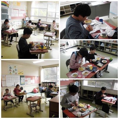 4年生が校外学習に出かけたため、3年生と6年生が一緒に給食を食べていました。少人数の本校では、ときどきこんなこともあります。