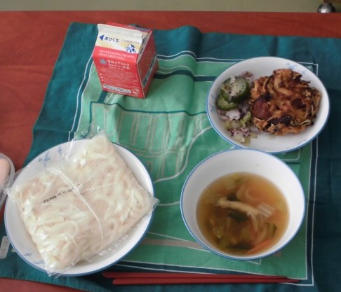 今日の給食は、野菜のかき揚げうどんです。カリカリのかき揚げと温かいうどんで心もお腹も満タンです。