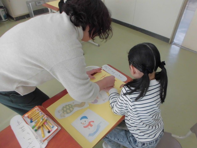 やまびこ組の図工では、年賀状づくりに取り組みました。四つ切り画用紙サイズの大きさの年賀状に模様を貼ったり、クレヨンで字を書き込んだりして作りました。