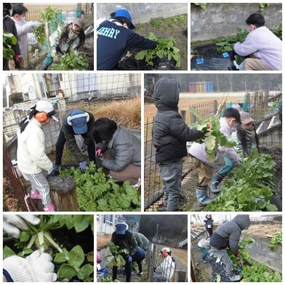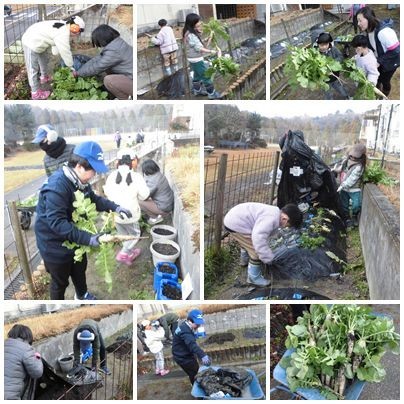 1・2年生とやまびこ組が、校舎南側の学級菜園で育てていたダイコンを収穫しました。