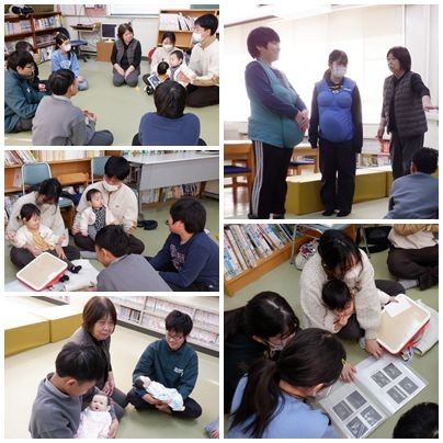 妊娠・出産期のことや子育ての様子について、写真などを交えてお話しいただき、6年生児童は、かわいらしい子どもたちの様子に微笑みながら「お父さんの思い」「お母さんのお思い」に聞き入っていました。赤ちゃんと触れあったり、重り入りのジャケットを着て妊婦さんのたいへんさを味わったり、赤ちゃん人形を抱っこしたり…、「命の大切さ」を感じる貴重な体験ができました。