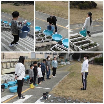 水が冷たかったので、保健室からバケツでお湯を運びました。洗剤やたわしを使って中までしっかり洗い、来年度に備えます。