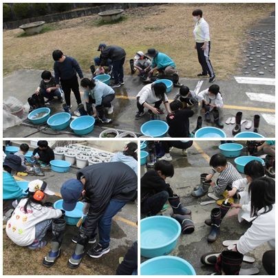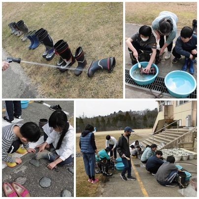 1・2年生とやまびこ学級が、長靴を洗っていました。1年間、田んぼの学習や環境整備作業などのときに使ってきた長靴です。