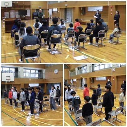 集会の後、6年生には先に教室に戻ってもらい、在校生が6年生を送る会の練習をしていました。内容は「まだ内緒」だそうですが、4年生が中心となり、がんばっています。