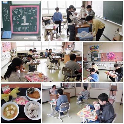 給食は、赤飯やクレープなどのお祝い献立でした。牛乳は、大きなリボン付き!リボンに書かれたメッセージに気がついた6年生は、とてもうれしそうでした。作ってくれたのは誰かな?
