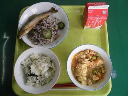 今日の給食はマーボー豆腐がメインです。でも本校はデザートが付きました。