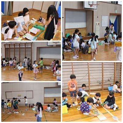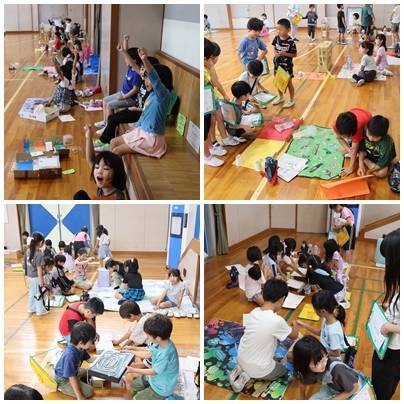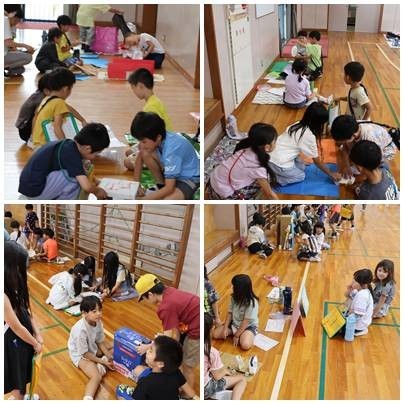 2年生が身近にあるものを使って作ったおもちゃで、1年生と一緒に遊びました。1年生にルールを説明して、遊び終わったらカードにシールを貼ってあげます。異学年交流は、下級生に対する優しい気持ち、上学年の自覚、上級生へのあこがれなどが自然と育まれていきます。