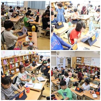 空き容器を使った作品の鑑賞をしました。自分の作品を写真に撮って全体共有します。たくさんの友達の作品を同時に観ることができて、それぞれのよさがよく伝わってきます。