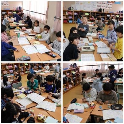 ひごを辺に、粘土を頂点に見立てて箱の形をつくります。グループで協力しながら形を組み立てる中で、箱のつくりや頂点と辺のつながりを確かめていきました。