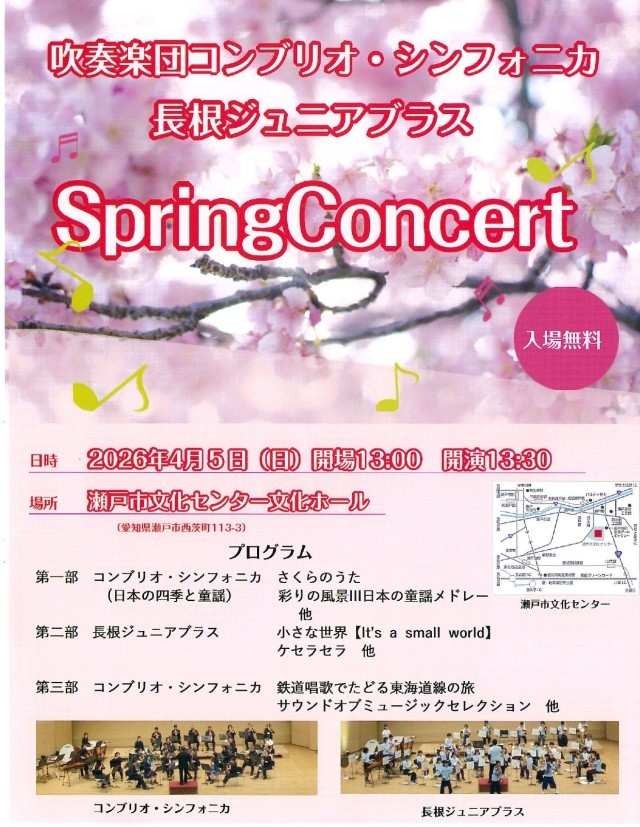 4月5日(日)瀬戸市文化センターで、日ごろ指導していただいているコンブリオ・シンフォニカさんと長根ジュニアブラス合同での、スプリングコンサートが開催されます。6年生にとっては卒業後にはなりますが、長根ジュニアブラスとしての最後の舞台となります。