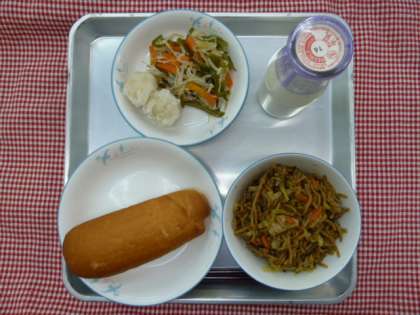 小型ロールパン・瀬戸焼きそば・えびシューマイ・くきわかめのナムル・牛乳でした。