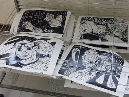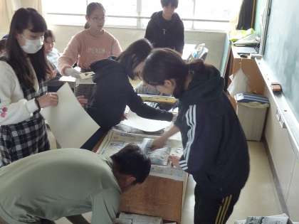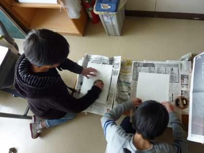 木版画をする6年生。
