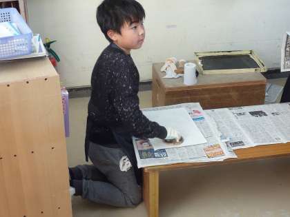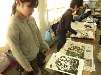 先生にインクをのせてもらい、一生懸命作品を仕上げます。