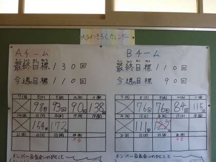 なわとび大会に向けて、チームごとの目標が掲げてありました。