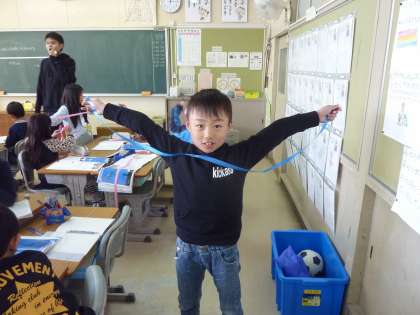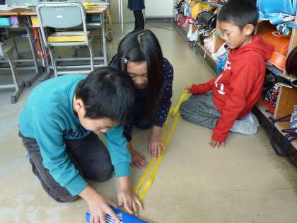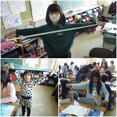 両手を広げた長さで、紙テープを切って友だちと比べています。
